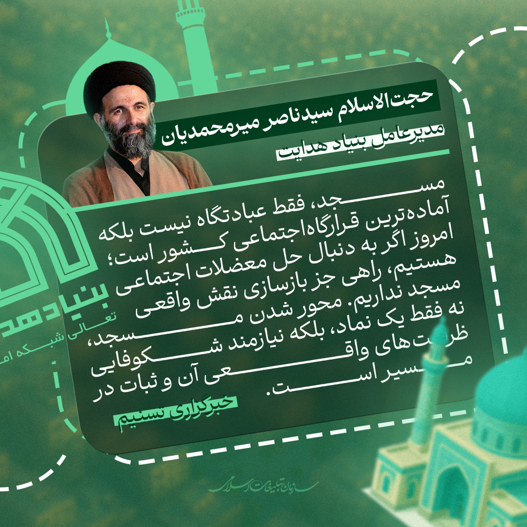 به گزارش روابط عمومی سازمان تبلیغات اسلامی، روزهای بحران اخیر بار دیگر نشان داد که مسجد می‌تواند نقش کلیدی در مدیریت محله‌ها و حل مشکلات و مسائل اجتماعی ایفا کند؛ ایده‌ای که شاید ماموریت اصلی بنیاد هدایت بوده‌ است در این سال‌ها. نظر اساتید را در مورد «نقش و جایگاه اجتماعی مساجد» بخوانید:
