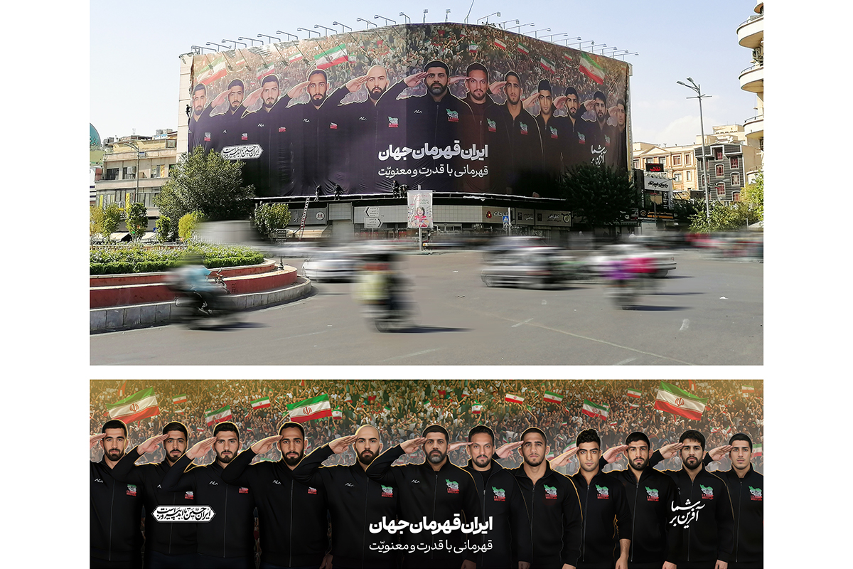 به گزارش روابط عمومی سازمان تبلیغات اسلامی، همزمان با درخشش غرورآفرین تیم ملی کشتی آزاد ایران در مسابقات جهانی زاگرب ۲۰۲۵ و کسب عنوان قهرمانی جهان، تازه‌ترین دیوارنگاره میدان انقلاب تهران با نقشی از ملی‌پوشان قهرمان تیم ملی کشتی آزاد کشورمان رونمایی شد. این طرح با شعار محوری «قهرمانی با قدرت و معنویت» اکران و در استودیو رواق تولید شده است. طراحی این دیوارنگاره با حمید ژولانژاد بوده و مدیریت هنری آن را علی بایبوردی بر عهده داشته است.