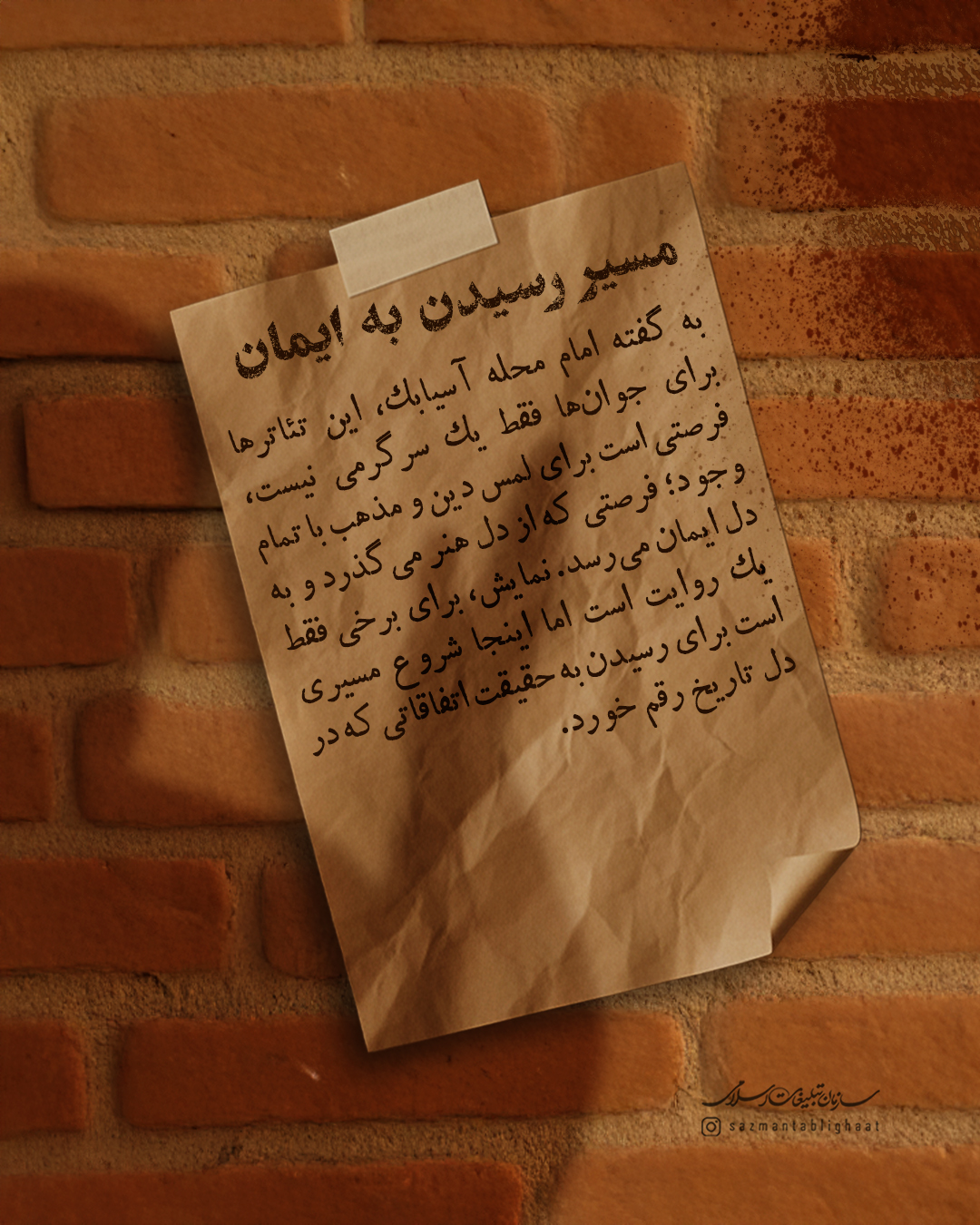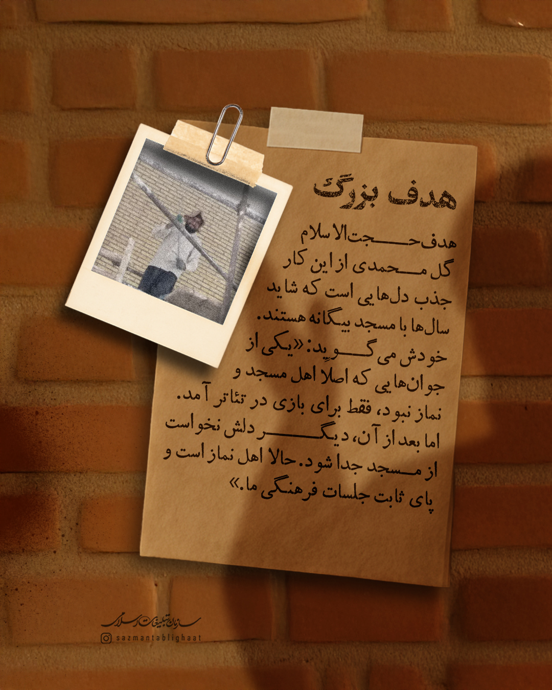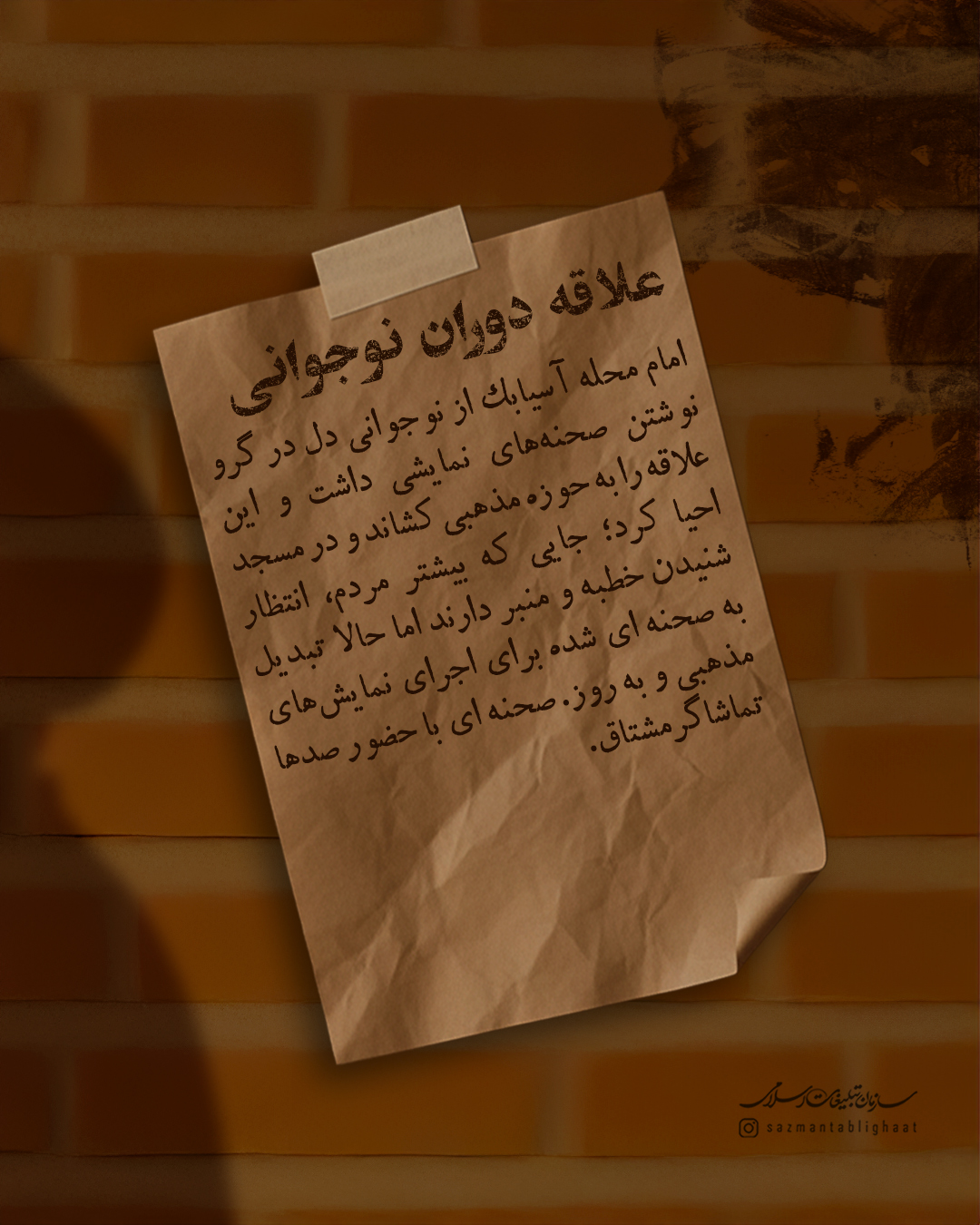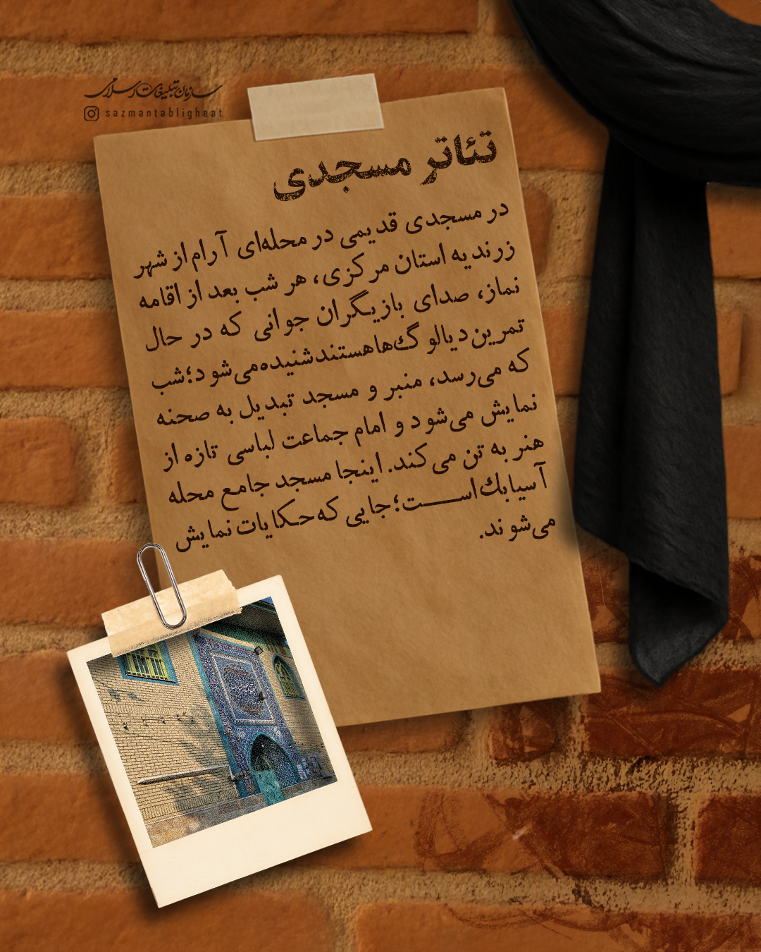 به گزارش روابط عمومی سازمان تبلیغات اسلامی، حجتالاسلام «محمود گلمحمدی» امام محله مسجد جامع آسیابک در شهر زرندیه استان مرکزی است. او که از نوجوانی به ادبیات و نمایشنامهنویسی علاقهمند بود، با نوشتن نمایشنامه و اجرای نمایش در مسجد تجربهی متفاوتی برای اهالی این محله فراهم کرده است. اتفاقی که منجر به رونق مسجد و حضور فعالانه مردم، خصوصا جوانان و نوجوانان، در مسجد شده است.