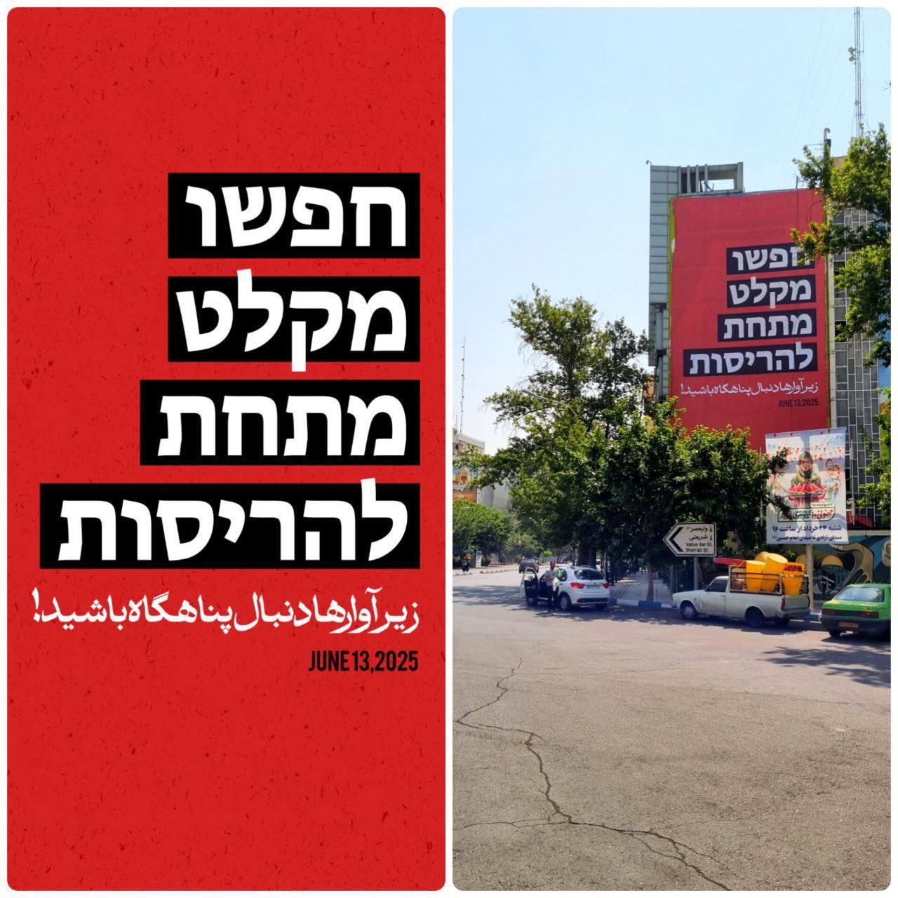 پس از جنایت سحرگاه  روز 23 خردادماه  رژیم صهیونیستی علیه کشورمان، دیوارنگاره میدان فلسطین تهران با پیامی به به زبان عبری رونمایی شد؛ «زیر آوارها دنبال پناهگاه باشید!»
