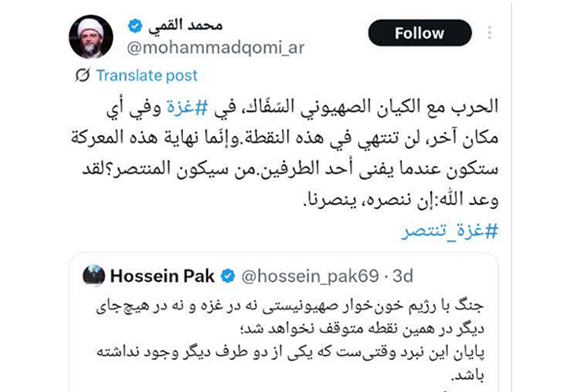 رئیس سازمان تبلیغات اسلامی همزمان با اعلام خبر آتش‌بس در غزه، توئیتی به زبان عربی منتشر کرد که بازنشر پست حسین پاک، فعال حوزه مقاومت در شبکه اجتماعی ایکس بود. حجت‌الاسلام قمی در این توئیت تاکید کرد؛ جنگ با رژیم خون‌خوار صهیونیستی نه در غزه و نه در هیچ‌جای دیگر در همین نقطه متوقف نخواهد شد.