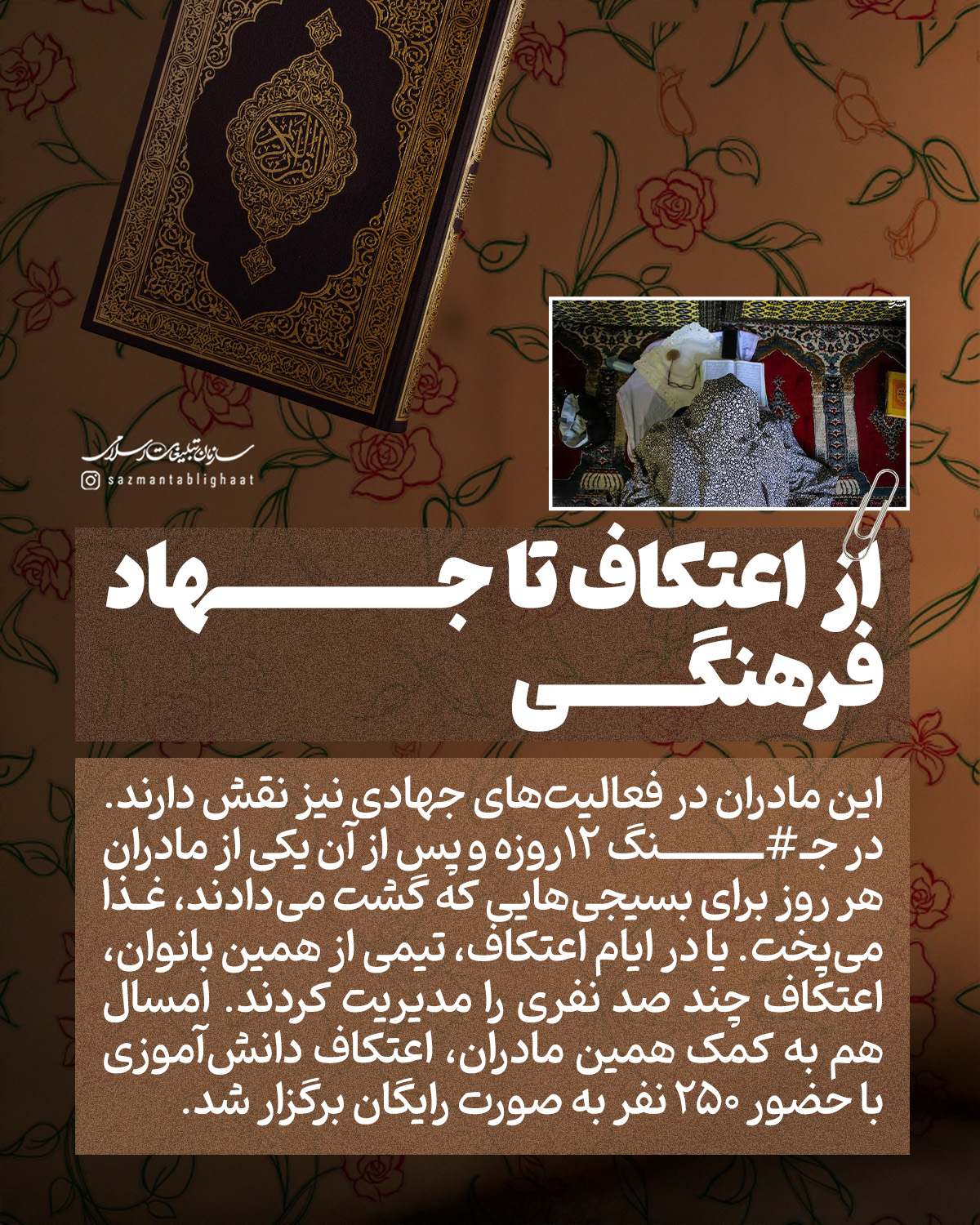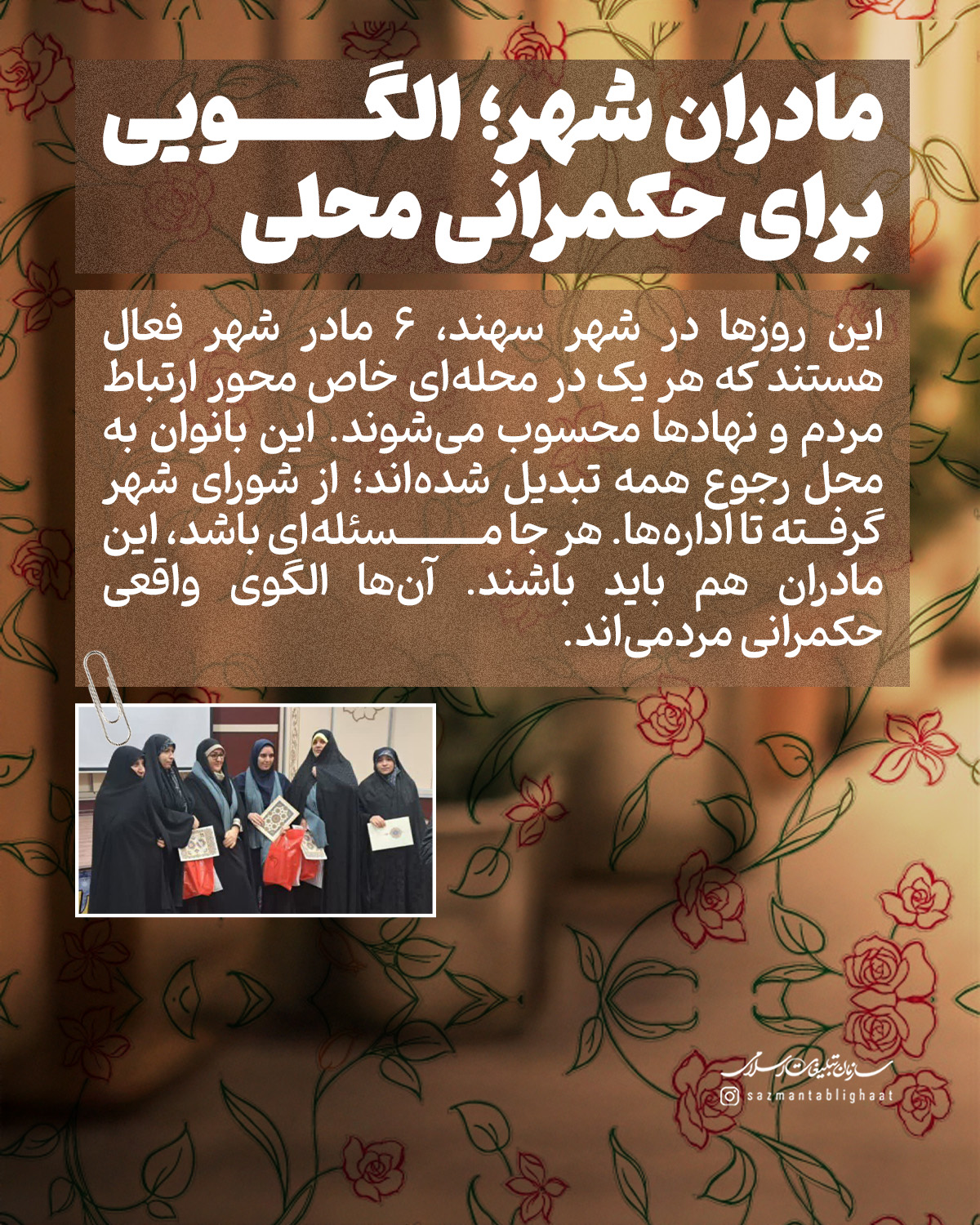 به گزارش روابط عمومی سازمان تبلیغات اسلامی، در شهر سهند آذربایجان شرقی، گروهی از بانوان خیر و باتجربه با نام «مادران شهر» نقشی کلیدی در حل مشکلات محلات ایفا می‌کنند. این طرح که به ابتکار حجت‌الاسلام حیدر مسن‌کر، رئیس اداره تبلیغات اسلامی سهند، شکل گرفته، مادران محلی را به حلقه‌ ارتباط میان مردم و نهادهای شهری تبدیل کرده است. از کمک به خانواده‌های نیازمند و مدیریت اعتکاف گرفته تا میانجی‌گری در مسائل اجتماعی؛ الگویی برای حکمرانی مردمی. در این شماره از نشریه دیجیتال از سهند و طرح مادران شهر می‌خوانیم.