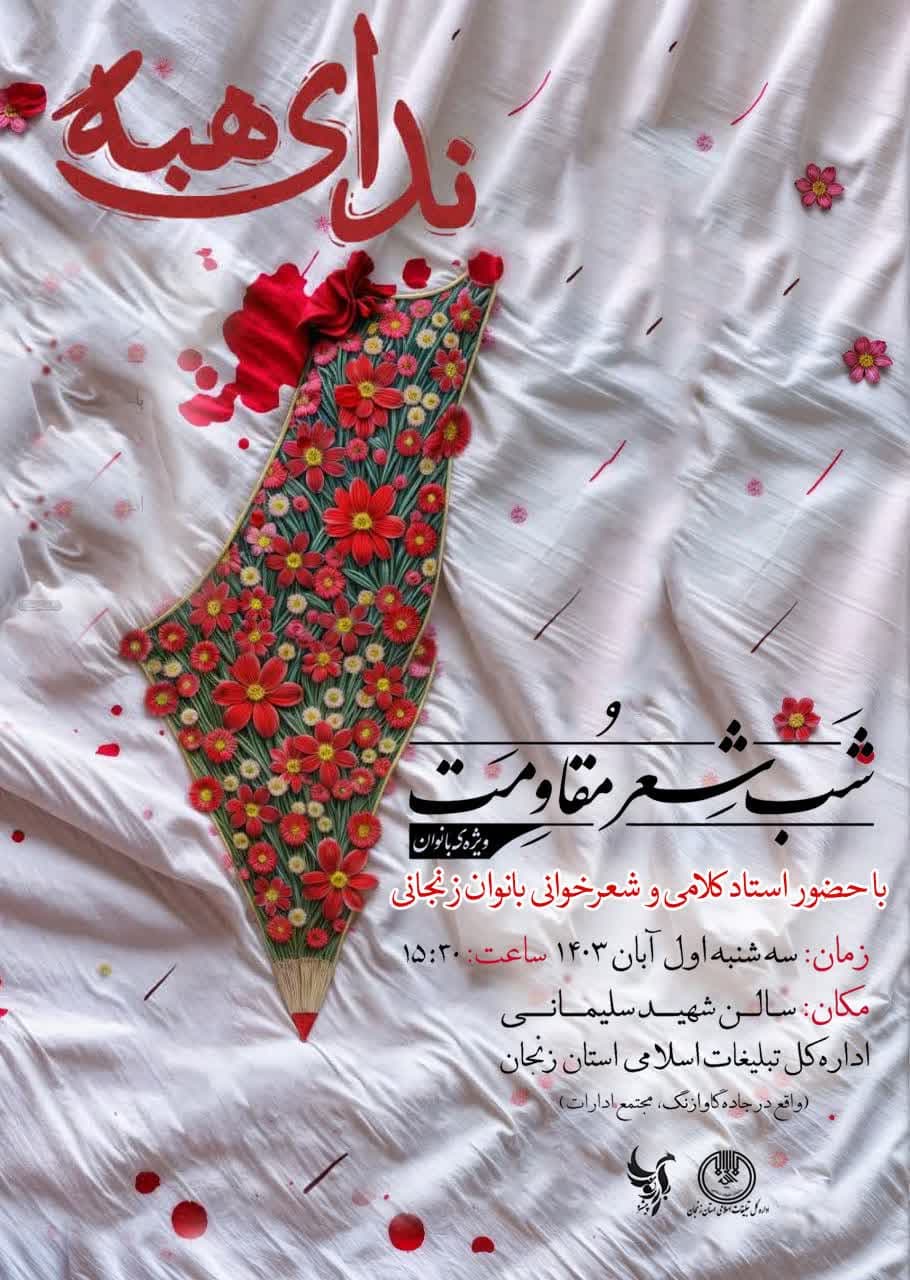 شب شعر مقاومت از ساعت 15/30 روز سه شنبه یکم آبان ماه 1403 در سالن همایش شهید سلیمانی اداره کل تبلیغات اسلامی استان زنجان برگزار میشود.