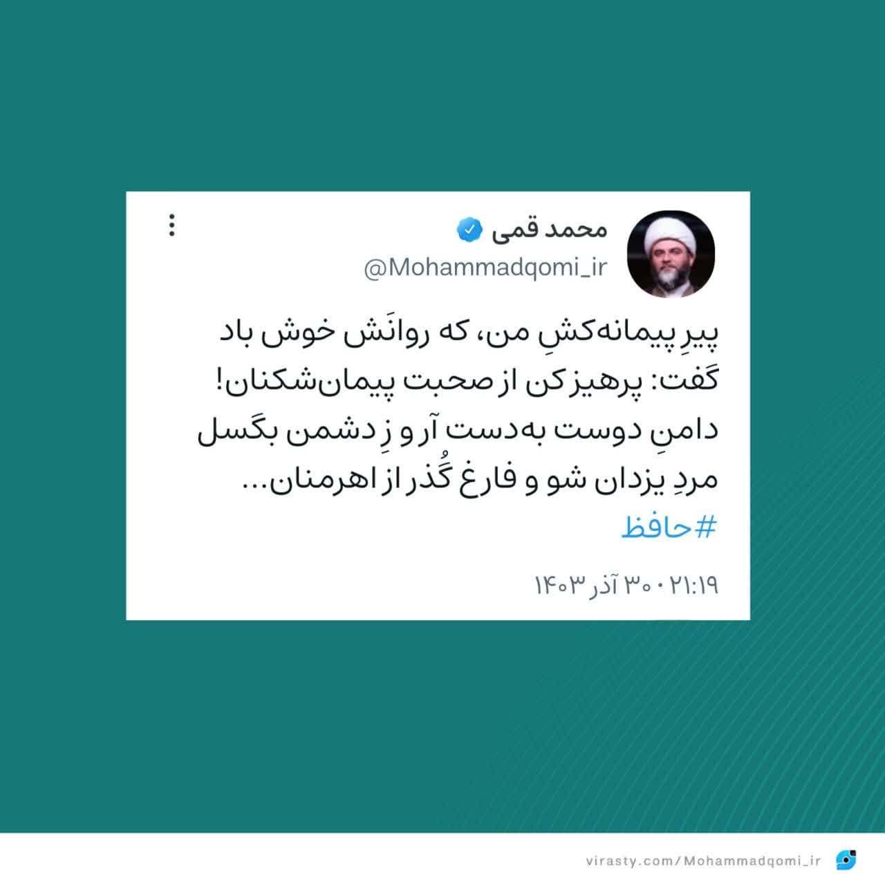 به گزارش روابط عمومی سازمان تبلیغات اسلامی، حجتالاسلام محمد قمی، رییس سازمان تبلیغات اسلامی همزمان با روز ترویج میهمانی و پیوند با خویشان و شب یلدا ابیاتی از لسانالغیب حافظ شیرازی را در صفحه شخصی خود در شبکه اجتماعی ویراستی منتشر کرد.