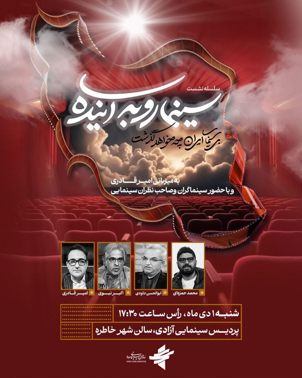 به گزارش روابط عمومی سازمان تبلیغات اسلامی، سلسله نشستهای «سینما رو به آینده» که به صورت ماهانه توسط سازمان سینمایی سوره و به میزبانی امیر قادری با حضور چهرههای مختلف سینمایی برگزار میشود، به ششمین جلسه رسیده است و شنبه اول دی ماه برگزار میشود.