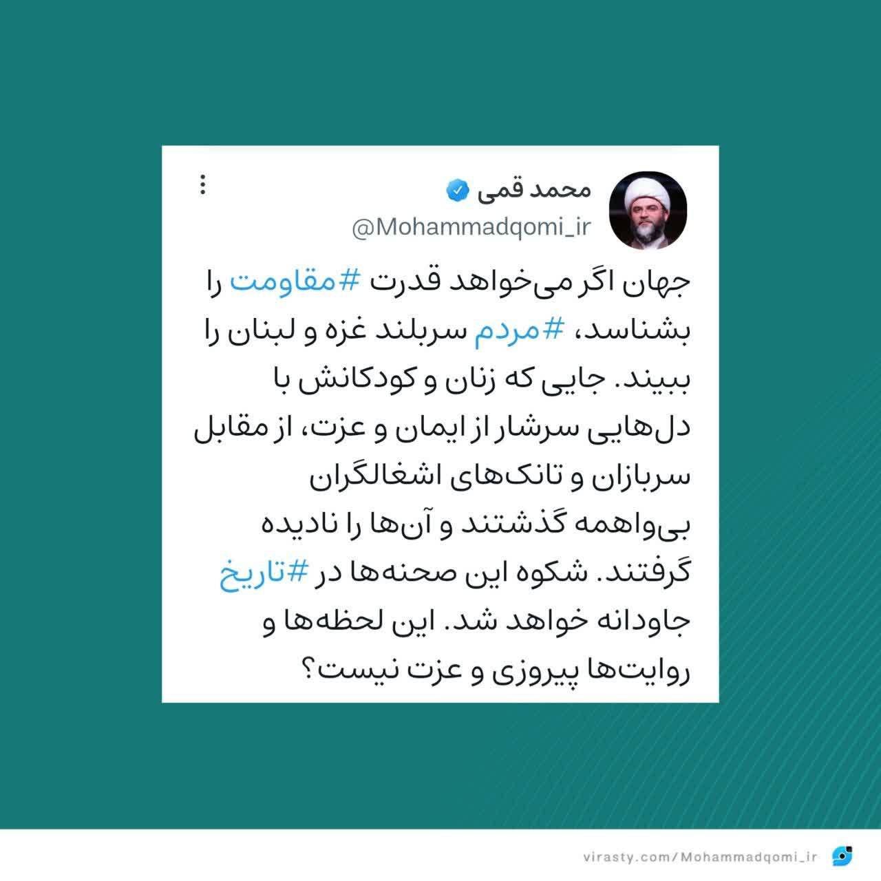 به گزارش روابط عمومی سازمان تبلیغات اسلامی، حجتالاسلام محمد قمی، رئیس سازمان تبلیغات اسلامی با انتشار ویدئو در شبکه ویراستی به تصاویر حماسی پربازدید این روزها از بازگشت مردم مقاوم جنوب لبنان و اهالی غزه به خانههایشان در اراضی آزاد شده از اشغال صهیونیستها و فیلمی از ایستادگی یک بانو محجبه مسلمان با دستان خالی رو در روی تانکهای اسرائیلی واکنش نشان داد.