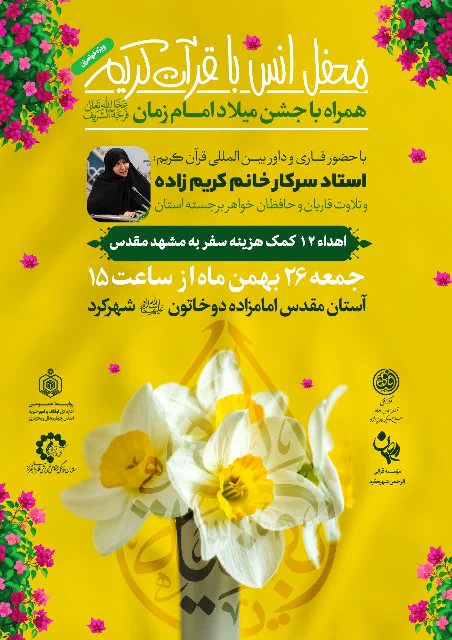 محفل انس با قرآن کریم ویژه بانوان ۲۶ بهمنماه همزمان با ولادت حضرت قائم(عج) در آستان مقدس امامزادگان حلیمه و حکیمه خاتون(س) شهرکرد برگزار میشود.