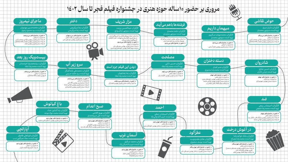 حوزه هنری انقلاب اسلامی در دهه اخیر راهی پر فراز و فرود را در ساخت فیلمهای کوتاه و سینمایی و حضور در جشنواره فیلم فجر طی کرده است؛ در چهل و سومین جشنواره فیلم فجر، مروری بر حضور ده ساله این سازمان در جشنواره فجر داشته باشیم. اطلاعنگاشت (اینفوگرافیک) فیلمهای تولید شده توسط حوزه هنری که در جشنواره فجر حضور داشتند و نامزد یا برنده جوایز این جشنواره شدهاند، در ادامه میآید.