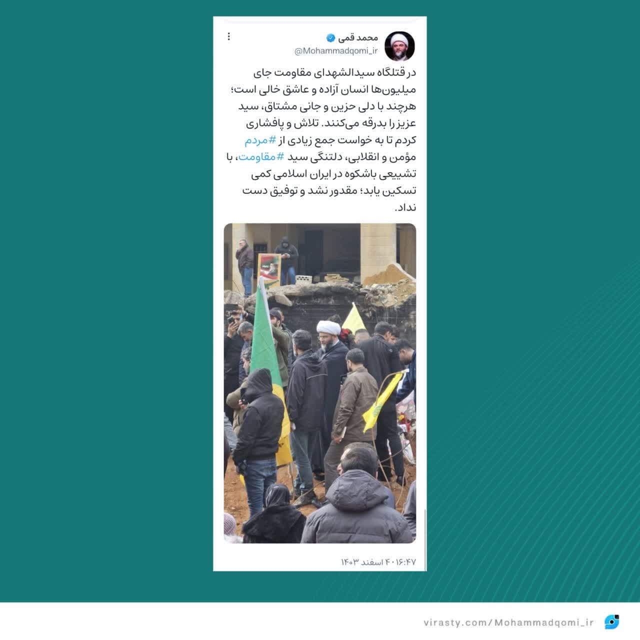 به گزارش روابط عمومی سازمان تبلیغات اسلامی، حجتالاسلام محمد قمی، رئیس سازمان تبلیغات اسلامی که در روز تدفین سید حسن نصرالله در محل شهادت وی حضور پیدا کرده بود با انتشار عکسی در شبکه اجتماعی ویراستی نوشت
