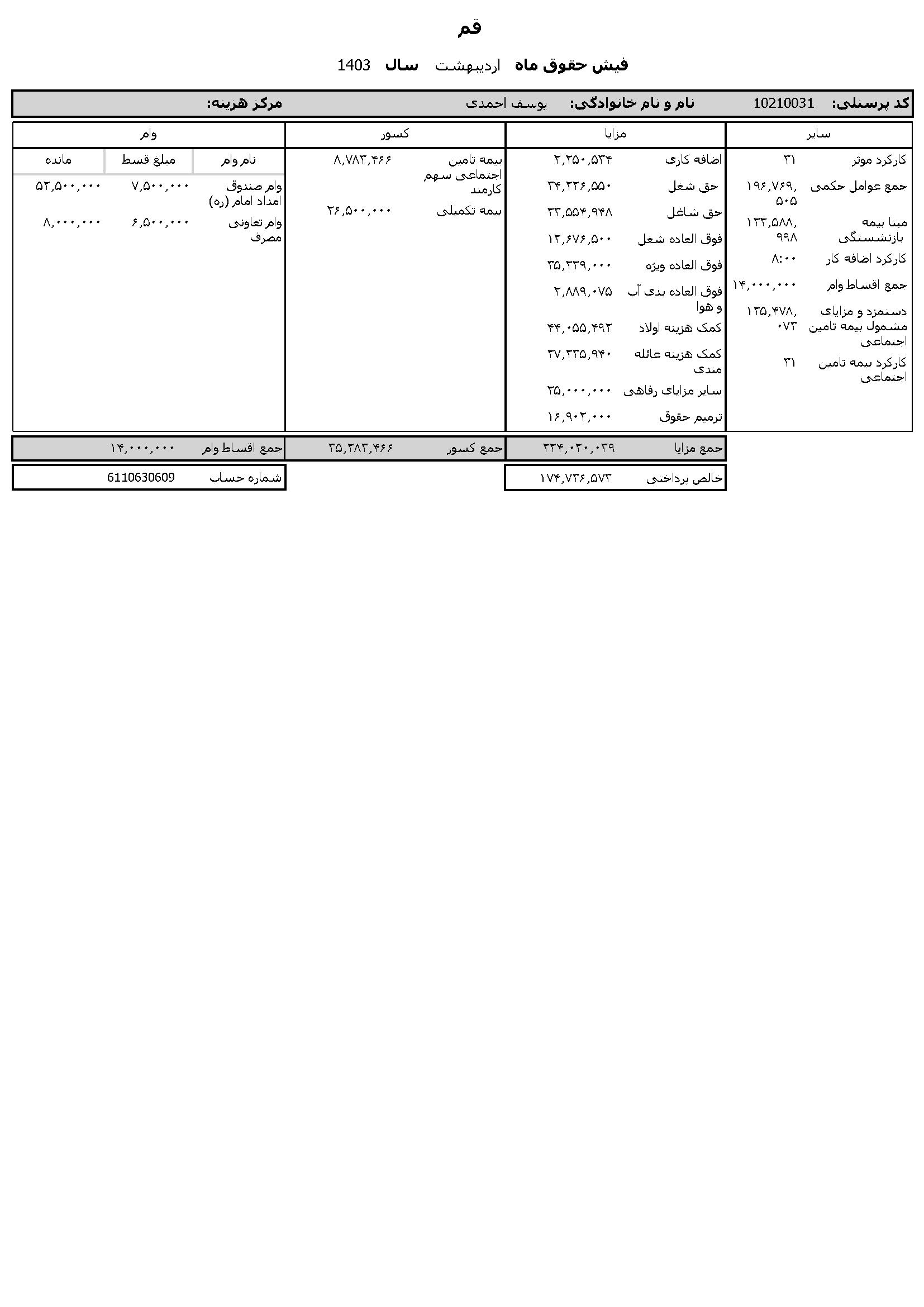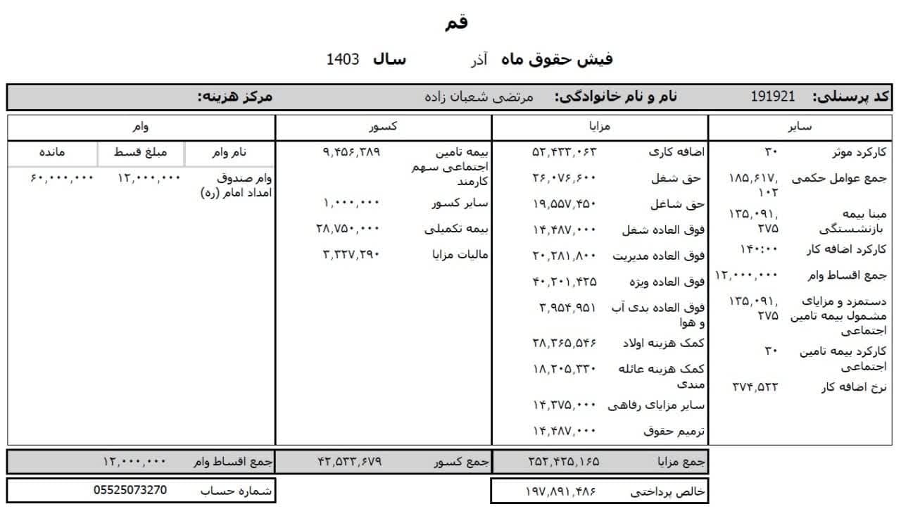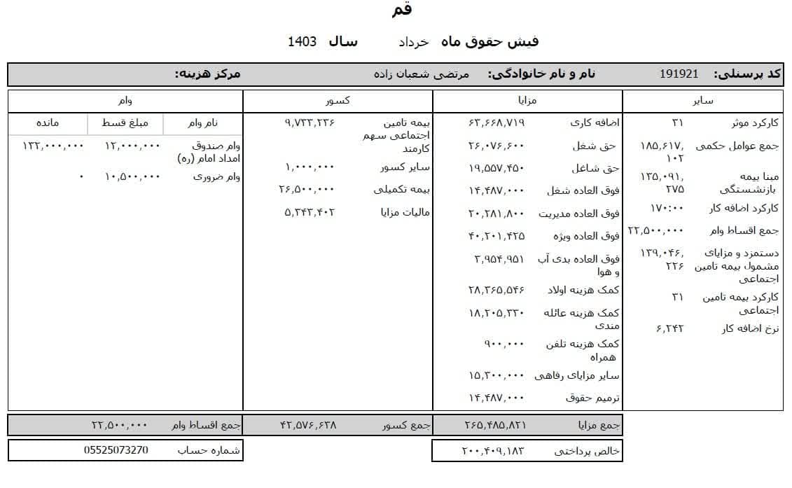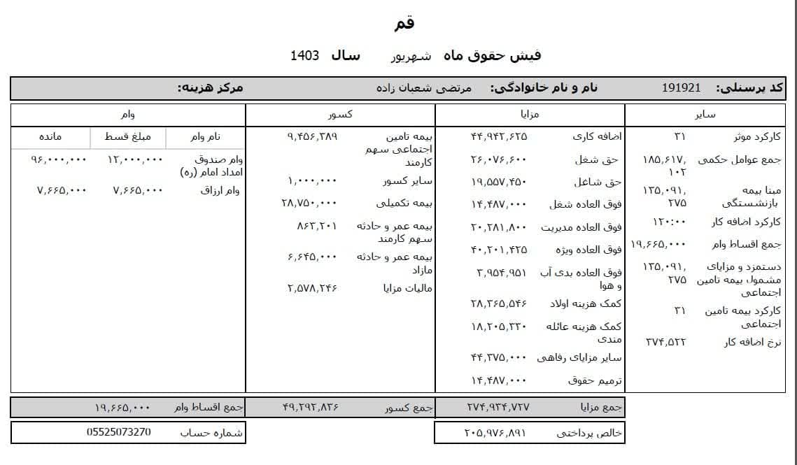 به گزارش روابط عمومی سازمان تبلیغات اسلامی، حقوق عمومی اطلاعات حقوق و مزایای 12 ماهه حجت الاسلام والمسلمین مرتضی شعبانزاده مدیر کل تبلیغات اسلامی استان قم و فیش حقوقی 12 ماهه حجت الاسلام والمسلمین یوسف احمدی معاون اداری و مالی منتشر شد.